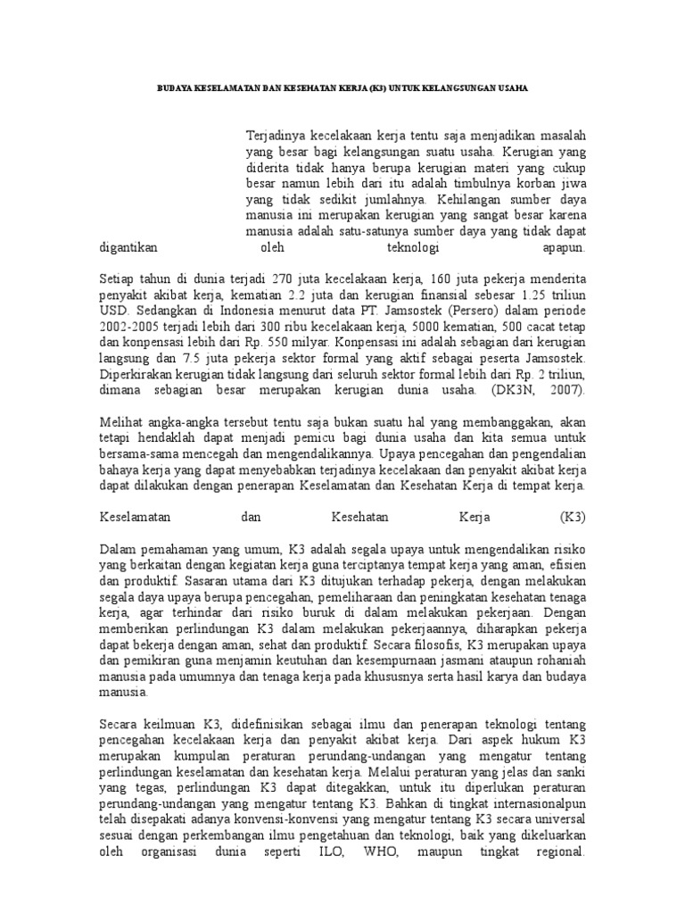 Makalah Kesehatan Dan Keselamatan Kerja . Perlunya Menjalankan Program K3 Kesehatan Keselamatan Kerja (K3) Adalah Sebuah Kondisi Di Mana Para Karyawan Terlindungi Dari Cedera Yang Disebabkan Oleh Berbagai Kecelakaan Yang Berhubungan Dengan Pekerjaan Tidak Seorang.